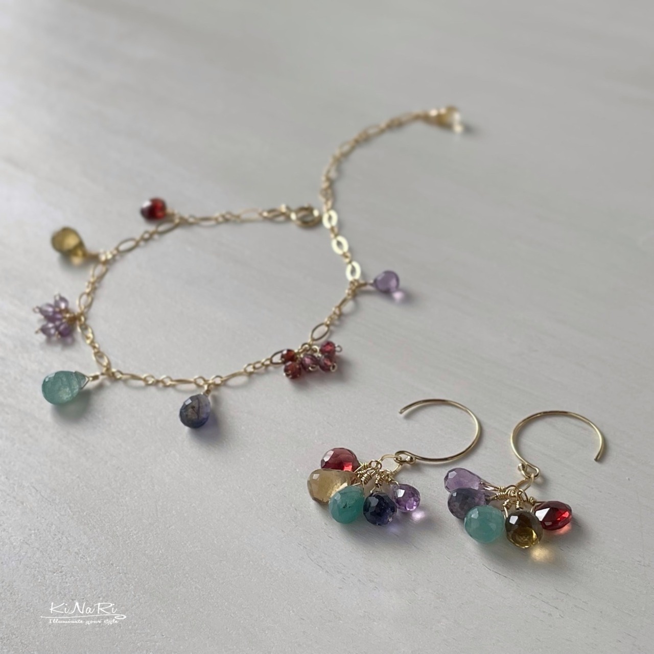 ディープな色調の天然石をランダムに並べて、カラフルな中にも落ち着きを感じられるカラーストーンアクセサリーにお仕立てしました。