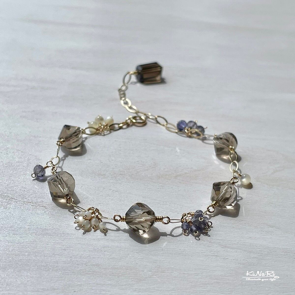 そのスモーキークォーツをバランスよく並べて、ツヤツヤの小さなホワイトシェル、透け感のある深いブルーが美しいアイオライトで彩りを添えました。