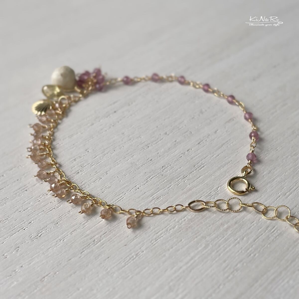 14金ゴールドフィルドのシェルチャームがワンポイント。